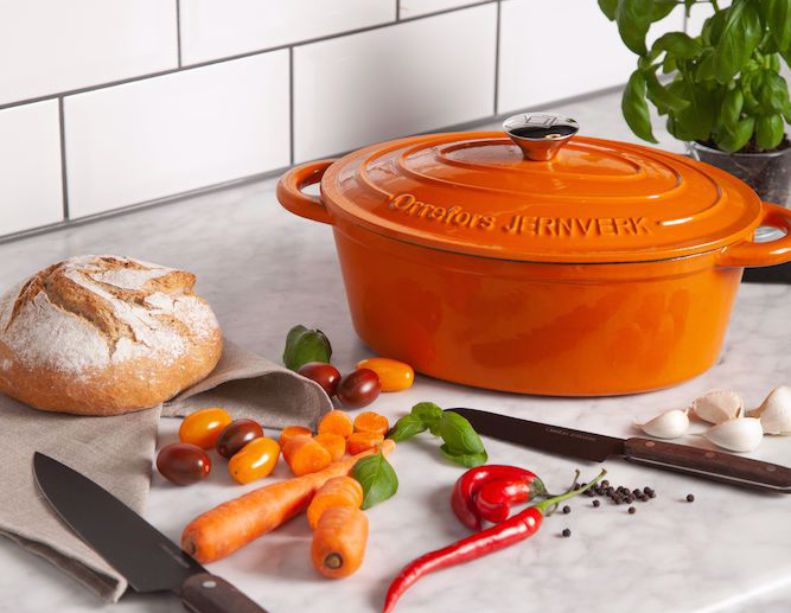 En lite större emaljerad gjutjärnsgryta i en oval form. En gedigen gryta perfekt för både långkok och vardagsmat.