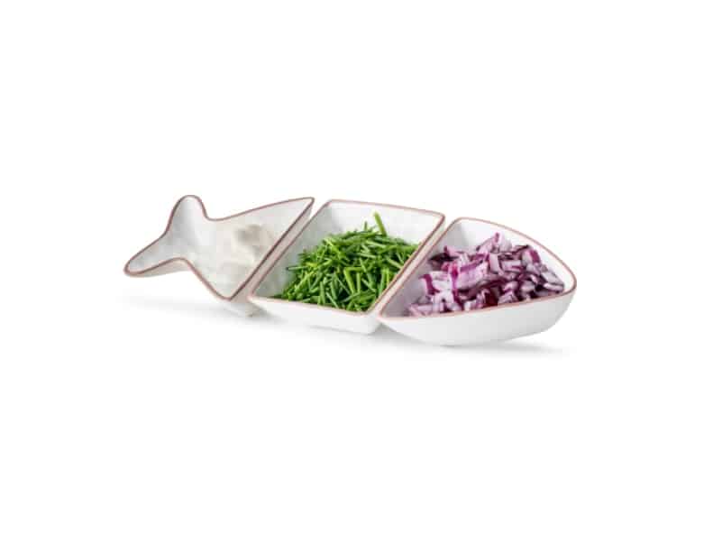 Set med serveringsskålar i tre delar som när de placeras ihop formar en fisk. En säker stämningshöjare till bordsdukningen och en rolig gåva att ge bort.