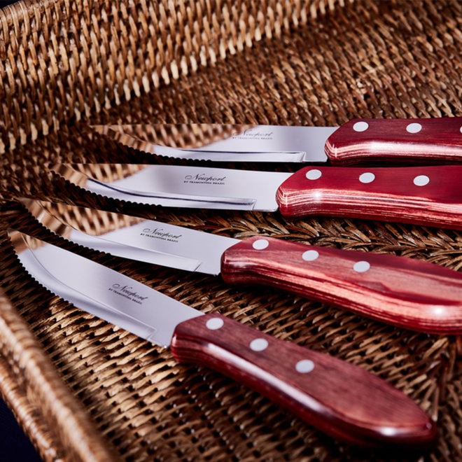 Detta kit består av 4 lyxiga jumbogrillknivar! Kombinationen av ett riktigt skönt handtag samt ett vasst tandat blad gör dessa knivar till riktigt utmärkta grillbestick! Handtag av rosenträ, blad av rostfritt stål. Levereras i en exklusiv presentkartong.