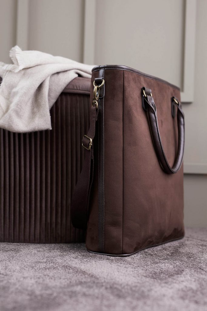 Väskan är i mockaimitation och har detaljer i PU-läder. Den passar bra att ha med sig oavsett om det är till skola, jobb eller en runda på stan. Den klassiska och tidlösa designen gör dessutom att den faller de flesta i smak. Väskan har ett vadderat fack som gör att du kan bära med dig din laptop på ett säkert och smidigt sätt. Du kan även välja om du vill bära väskan i de två handtagen eller med axelremmen som försetts med axelvaddering för ytterligare bekvämlighet.