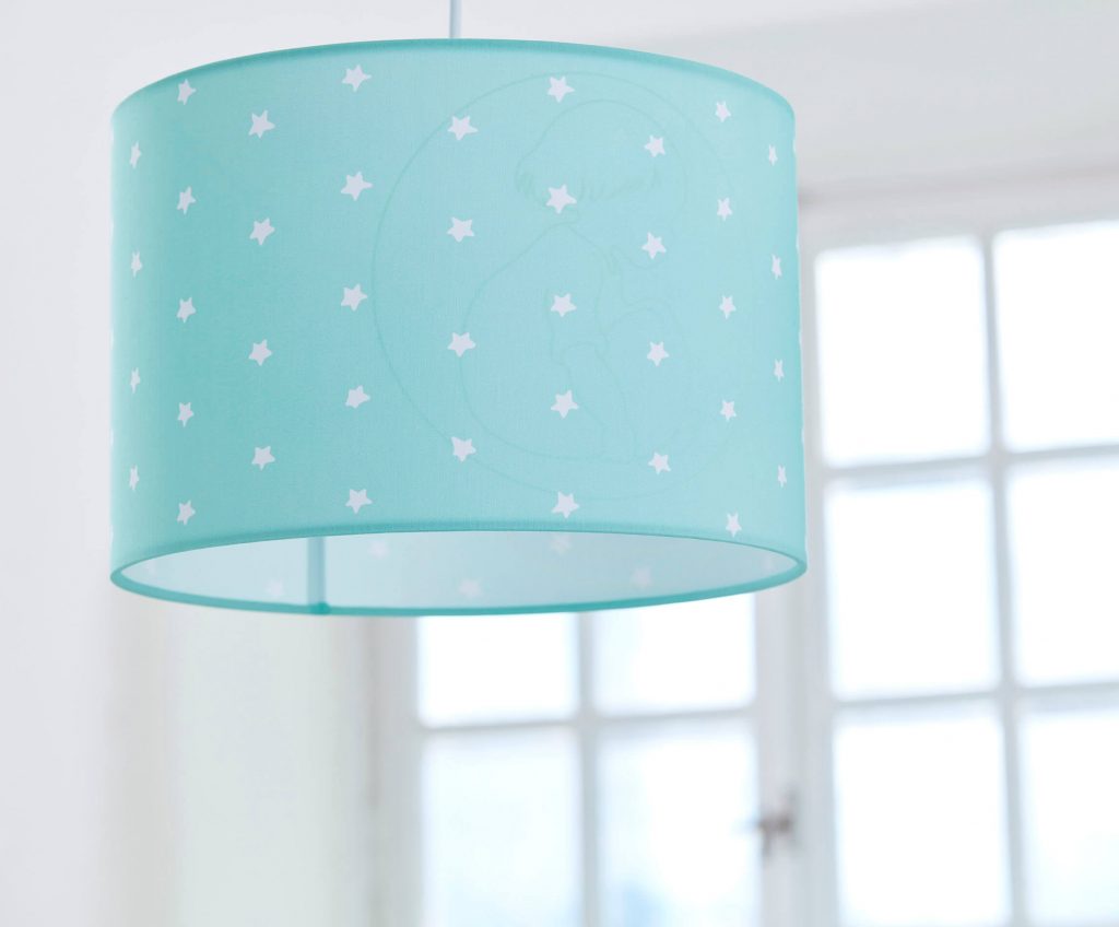 VINGA E TAKLAMPA MINT november 2, 2020 Taklampa i mint med små stjärnor. Barnkammarbokens logga syns när lampan är tänd. H20cm Diameter 30cm.